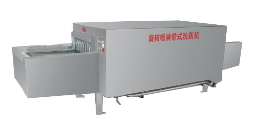 The conveying motor drives the chain wheel, the front roller and apron chain net. And the rolling motor could achieve the result that eight faucets spray water repeatedly at the same time through the chain roller, the chain and the eccentric device. In this way the machine can save about 50% water. Thus it could meet the requirements of GMP.